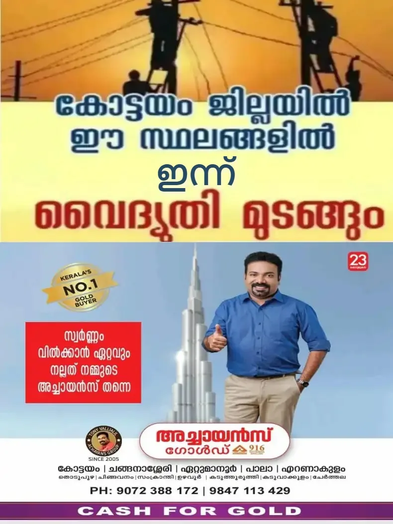 കുറിച്ചി ഇലക്ട്രിക്കൽ സെക്ഷന്റെ പരിധിയിൽ വരുന്ന മലകുന്നം, പ്ലാമൂഡ്, റൈസിംഗ് സൺ എന്നീ ട്രാൻസ്ഫോർമറുകളുടെ കീഴിൽ വരുന്ന സ്ഥലങ്ങളിൽ നാളെ 23/09/2024ന് രാവിലെ 9:30 മുതൽ വൈകിട്ട് 5:30 വരെ വൈദ്യുതി മുടങ്ങുന്നതാണ്.