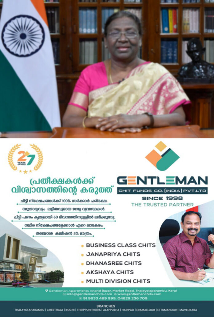 24 വരെ രാഷ്ട്രപതി കേരളത്തിലുണ്ടാകും. 23നു വൈകുന്നേരം നാലിന് പാലാ സെന്റ് തോമസ് കോളജ് പ്ലാറ്റിനം ജൂബിലി സമാപനത്തില് മുഖ്യാതിഥിയായി പങ്കെടുക്കും.