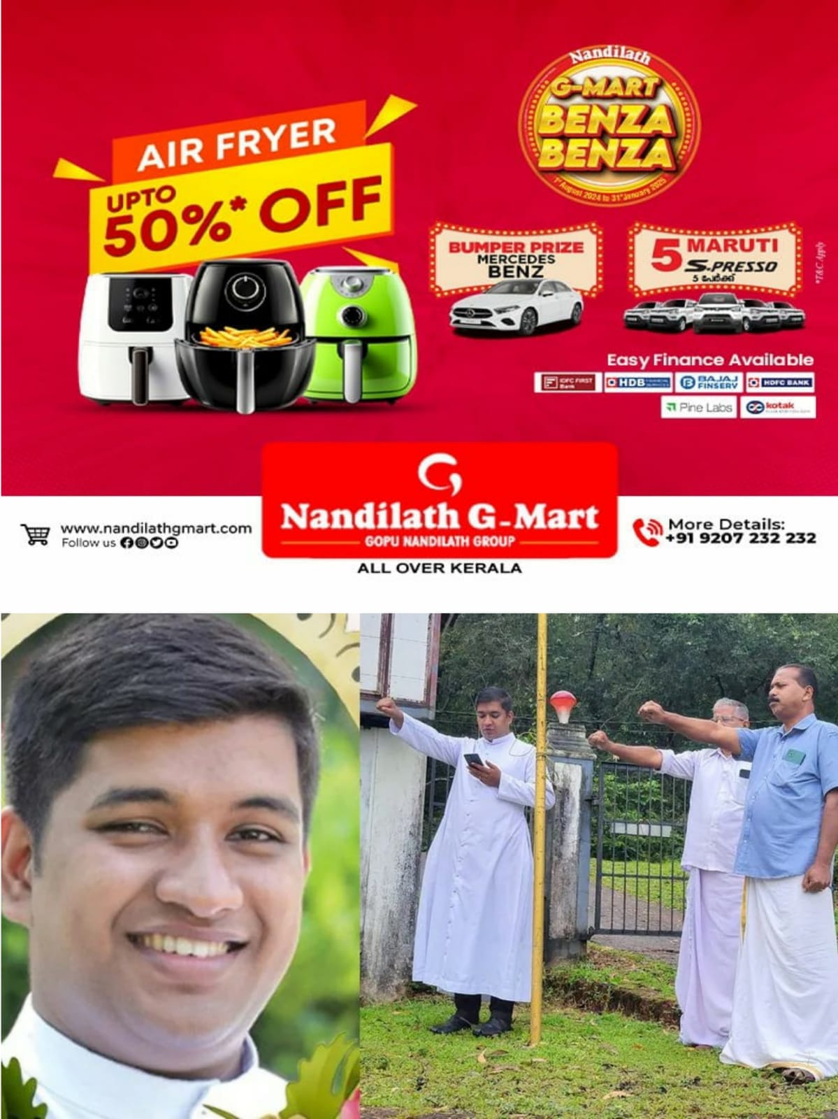 കാസര്കോട് : ദേശീയപതാക താഴ്ത്തുന്നതിനിടെ ഇരുമ്പ് കൊടിമരം വൈദ്യുതി കമ്പിയിലേക്ക് മറിഞ്ഞുവീണ് ഷോക്കേറ്റ് വൈദികന് മരിച്ചു. മുള്ളേരിയ ഇന്ഫന്റ് ജീസസ് ചര്ച്ചിലെ വികാരി തലശ്ശേരി അതിരൂപതാംഗം ഇരിട്ടി എടൂര് കുടിലില് വീട്ടില് ഫാ. മാത്യു കുടിലില്(ഷിന്സ് അഗസ്റ്റിന്-29) ആണ് മരിച്ചത്.