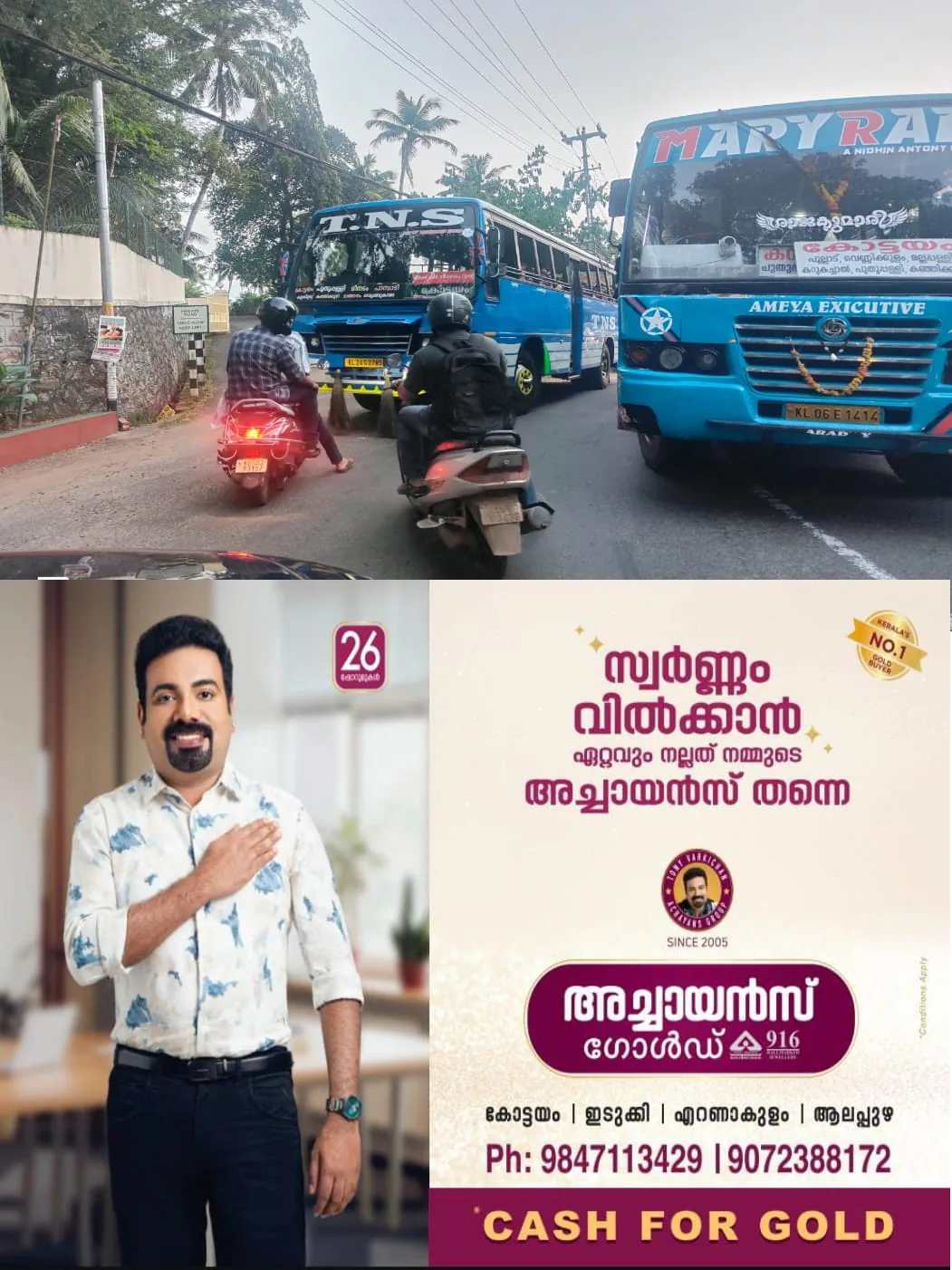 കഞ്ഞിക്കുഴി പുതുപ്പള്ളി റൂട്ടിൽ മടുക്കാനി ഭാഗത്ത് ഗതാഗത കുരുക്കിൽ കുടുങ്ങി റോഡിൻ്റെ ഒരു ഭാഗം പൂർണ്ണമായും വാഹനങ്ങൾ തിങ്ങി നിറഞ്ഞ് കിടക്കുകയായിരുന്നുമറുഭാഗത്ത് റോങ് സൈഡിലൂടെ അമിതവേഗതയിൽ കയറി വരുകയായിരുന്നു പാമ്പാടി കോട്ടയം റൂട്ടിലോടുന്ന ടിഎൻഎസ് ബസ്.
