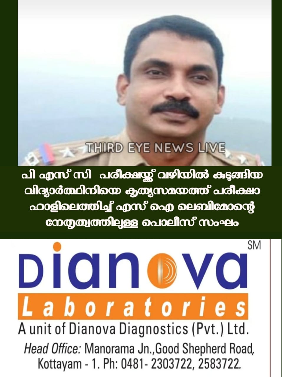 കോട്ടയം: പി എസ് സി ടെസ്റ്റിന് എത്തി വഴിയിൽ കുടുങ്ങിയ വിദ്യാർത്ഥിനിയെ കൃത്യ സമയത്ത് പരീഷ ഹാളിൽ എത്തിച്ച പാമ്പാടി എസ്. ഐ ലെബിമോൻ്റെ നേതൃത്തത്തിലുള്ള പോലീസ് സംഘമാണ് താരങ്ങൾ.