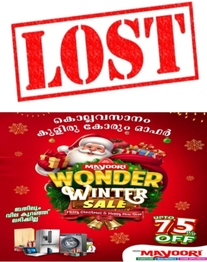 കണ്ടുകിട്ടുന്നവർ 7994558215 എന്ന നമ്പറിൽ ബന്ധപ്പെടുക