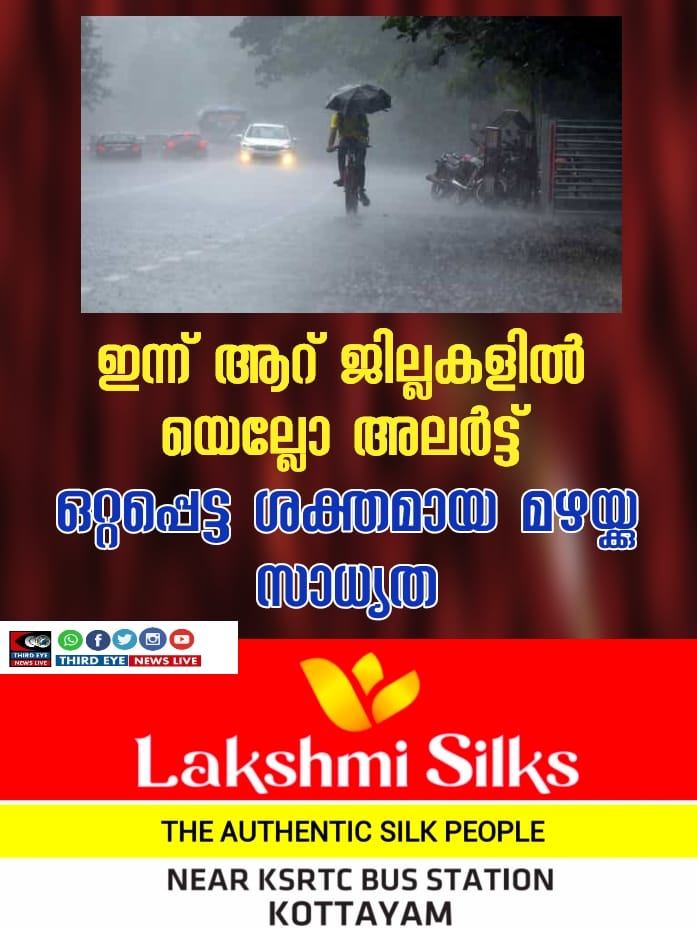തിരുവനന്തപുരം: വിവിധ ജില്ലകളിൽ കേന്ദ്ര കാലാവസ്ഥ വകുപ്പ് യെല്ലോ അലർട്ടുകൾ പ്രഖ്യാപിച്ചു. തിങ്കളാഴ്ച ആറ് ജില്ലകളിലാണ് യെല്ലോ അലർട്ട് പ്രഖ്യാപിച്ചത്. പത്തനംതിട്ട, ആലപ്പുഴ, കോട്ടയം, എറണാകുളം, ഇടുക്കി, തൃശൂർ ജില്ലകളിലാണു ജാഗ്രതാ നിര്ദേശം. ഒറ്റപ്പെട്ട ശക്തമായ മഴയ്ക്കുള്ള സാധ്യതയാണ് പ്രവചിക്കുന്നത്.