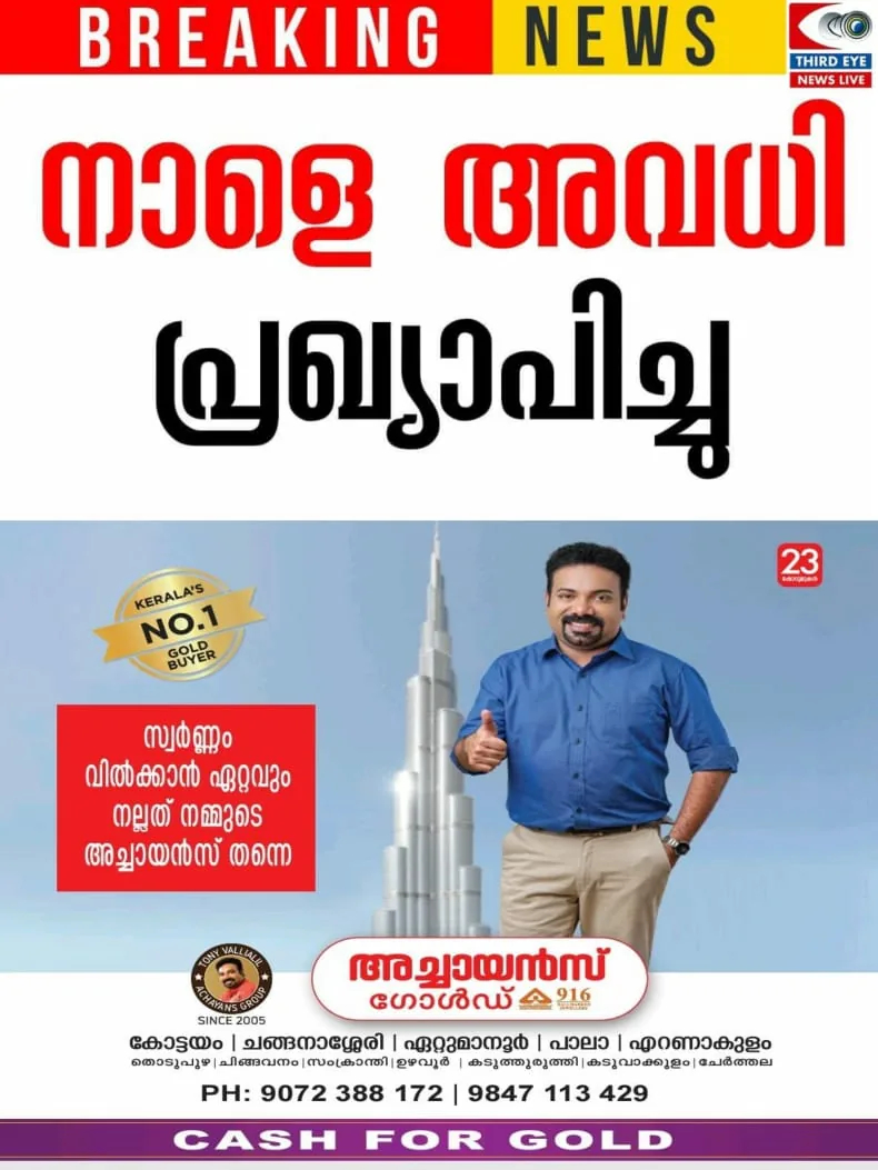 കനത്ത കാലവർഷത്തിൻ്റെയും മഴക്കെടുതികളുടെയും പശ്ചാത്തലത്തില് പാലക്കാട് ജില്ലയിലെ പ്രൊഫഷണല് കോളേജുകള്, അംഗണവാടികള്, കിൻറർഗാർട്ടൻ, മദ്രസ്സ, ട്യൂഷൻ സെൻ്റർ ഉള്പ്പെടെ എല്ലാ വിദ്യാഭ്യാസ സ്ഥാപനങ്ങള്ക്കും 19.07.2024 ന് ജില്ലാ കലക്ടർ അവധി പ്രഖ്യാപിച്ചു. മുൻകൂട്ടി നിശ്ചയിച്ച പൊതു പരീക്ഷകള്ക്കും റസിഡൻഷ്യല് രീതിയില് പഠനം നടത്തുന്ന മോഡല് റസിഡൻഷ്യല് സ്കൂളുകള്ക്കും നവോദയ വിദ്യാലയത്തിനും അവധി ബാധകമല്ല. കുട്ടികള് തടയണകളിലും പുഴകളിലും ഇറങ്ങാതെ വീട്ടില് തന്നെ സുരക്ഷിതമായി ഇരിക്കാൻ ശ്രദ്ധിക്കേണ്ടതാണ്. മേഖല, ജില്ലാതലങ്ങളില് മുൻകൂട്ടി നിശ്ചയിച്ച പാഠ്യ, പാഠ്യേതര പരിപാടികള് നടത്തുന്നുണ്ടെങ്കില് സംഘാടകർ ഔദ്യോഗികാനുമതി വാങ്ങേണ്ടതും വിദ്യാർത്ഥികളുടെ പൂർണ്ണ സുരക്ഷിതത്വം ഉറപ്പാക്കേണ്ടതുമാണ്.