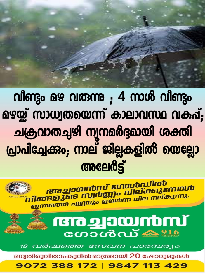 തിരുവനന്തപുരം: നാളെ മുതൽ 4 ദിവസം സംസ്ഥാനത്ത് വ്യാപക മഴയ്ക്ക് സാധ്യത ഉള്ളതായി കാലാവസ്ഥ വകുപ്പ്. മഴ പെയ്യാനുള്ള സാധ്യത കണക്കിലെടുത്ത് നാല് ജില്ലകളിൽ യെല്ലോ അലേർട്ട് പ്രഖ്യാപിച്ചിട്ടുണ്ട്. എറണാകുളം, കോഴിക്കോട്, കണ്ണൂര്, കാസര്കോട് ജില്ലകളിൽ ആണ് യെല്ലോ അലേര്ട്ട് മുന്നറിയിപ്പ്.
