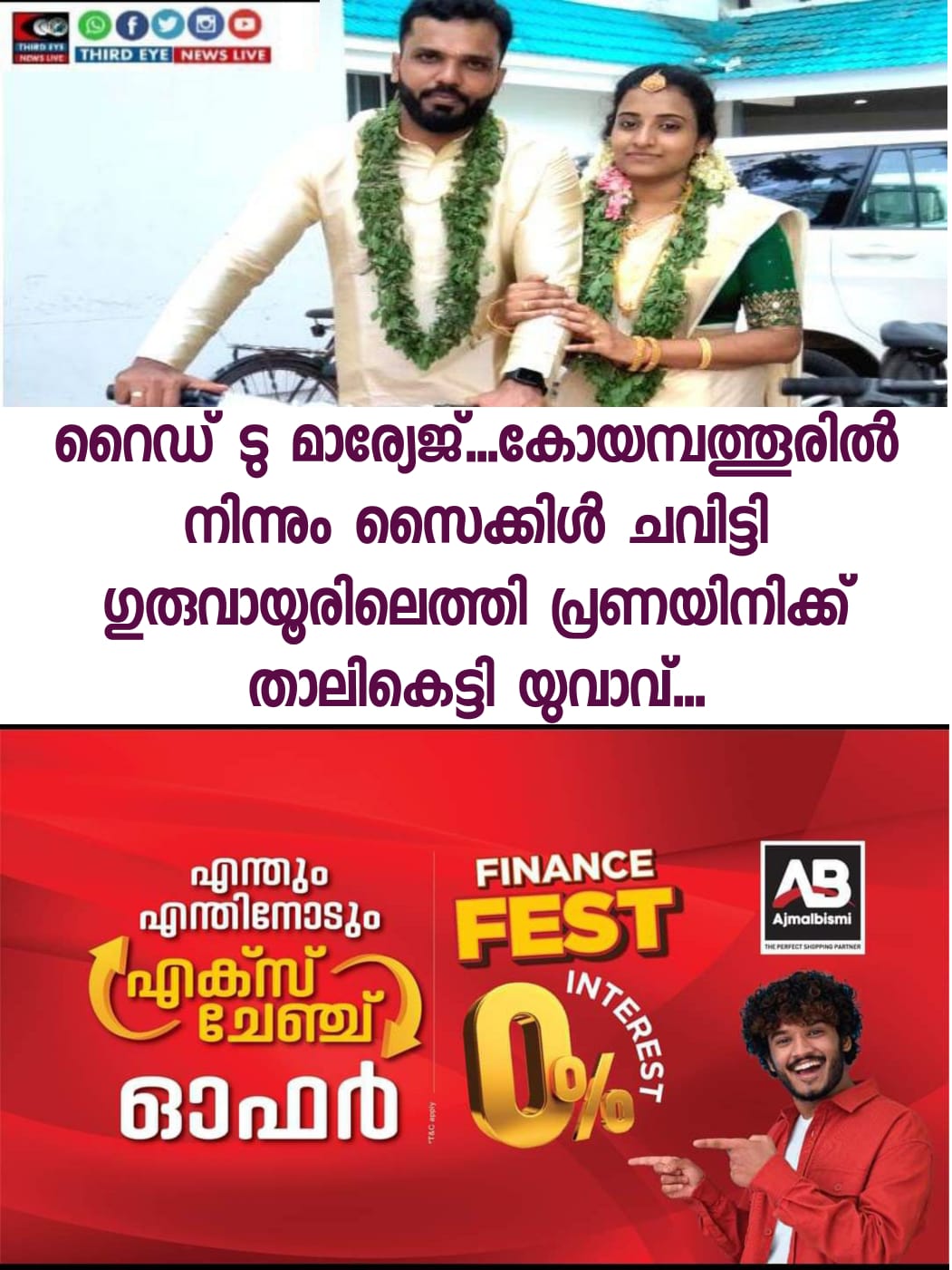 ക്ഷേത്രത്തിന് മുന്നിലെ കല്യാണ മണ്ഡപത്തില് പ്രണയിനിയെയാണ് വരന് താലി ചാര്ത്തിയത്. തുടര്ന്ന് സ്വദേശമായ കോയമ്പത്തൂര്ക്ക് 5 കൂട്ടുകാര്ക്ക് ഒപ്പം സൈക്കിളില് യാത്ര തിരിച്ചു. വധുവും സംഘവും വരന് എത്തുന്ന സമയം കണക്കാക്കി സാവധാനം കോയമ്പത്തൂര്ക്ക് പോയി. ‘റൈഡ് ടു മാര്യേജ്’ എന്നാണ് സൈക്കിള് യാത്രയ്ക്ക് നല്കിയ പേര്.