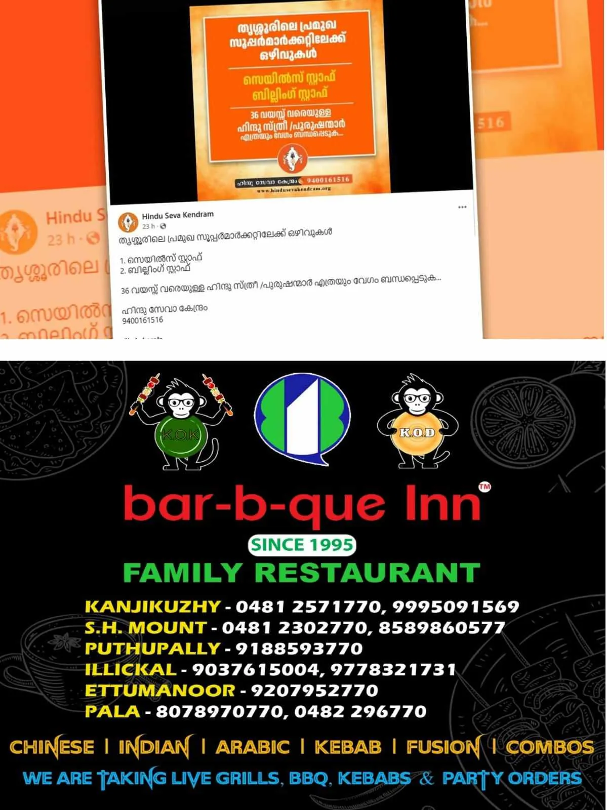 ‘ഹിന്ദു’ സ്ത്രീയോ പുരുഷനോ ആണെങ്കില് ജോലിക്കെടുക്കാമെന്ന പരസ്യവുമായി ഹിന്ദു സേവാ കേന്ദ്രത്തിന്റെ പരസ്യം. തൃശൂരിലെ പ്രമുഖ സൂപ്പർ മാർക്കറ്റിലേക്കാണ് ഒഴിവുകളെന്നാണ് സാമൂഹ്യ മാധ്യമങ്ങള് വഴി പ്രചരിപ്പിക്കുന്ന പോസ്റ്ററില് പറയുന്നത്.