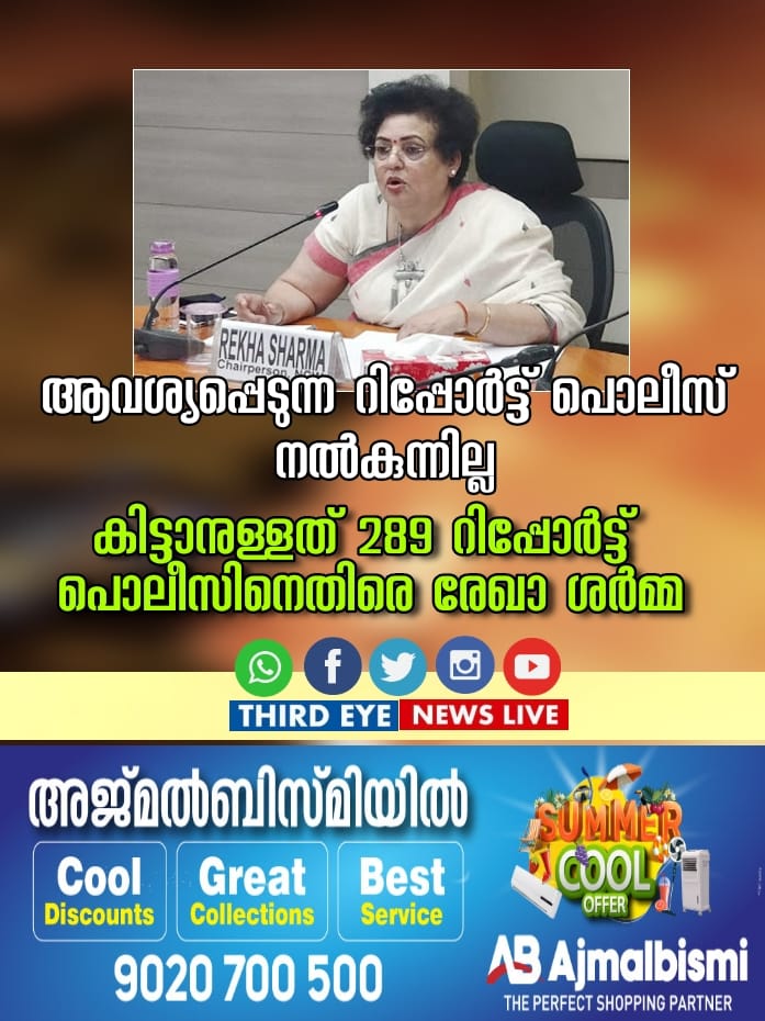 289 കേസുകളിൽ പൊലീസ് റിപ്പോർട്ട് കമ്മീഷൻ കാത്തിരിക്കുന്നു. ആവർത്തിച്ച് നോട്ടീസുകള് നൽകിയിട്ടും പൊലീസ് റിപ്പോർട്ട് നൽകുന്നില്ല. റിപ്പോർട്ടുകള് വൈകുന്നതിനാൽ കമ്മീഷൻ പരാതികളിൽ തീർപ്പുണ്ടാക്കാനും കഴിയുന്നില്ലെന്നാണ് രേഖാശർമ്മയുടെ വിമർശനം.