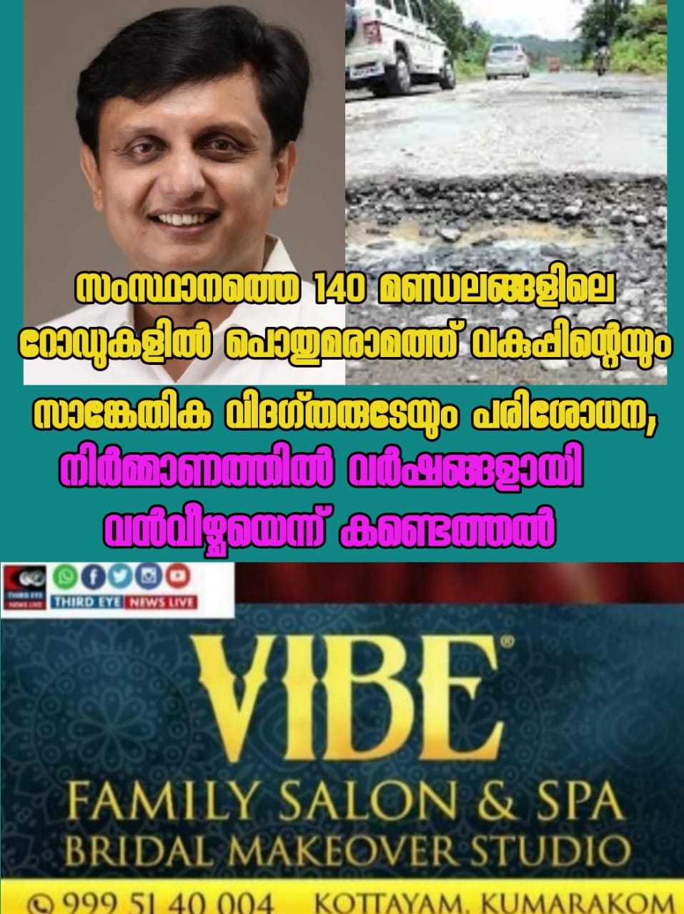 കേരളത്തിലെ 140 മണ്ഡലങ്ങളിലെ പ്രധാന റോഡുകളിലായിരുന്നു പരിശോധന നടത്തിയത്.ബിസി ആന്ഡ് ബിഎം ( ബിറ്റുമിന് മെക്കാഡം ബിര്റുമിന് കോണ്ഗ്രീറ്റ്) നിലവാരത്തില് നിര്മ്മിക്കുന്ന റോഡുകളില് സാങ്കേതിക വിദ്യകള് മുഴുവനും ഉപയോഗിച്ചിട്ടില്ല. മൂന്ന് തരത്തിലുള്ള റോളര് ഉപയോഗിച്ച് വേണം റോഡുകള് നിര്മ്മിക്കാന്. വര്ഷങ്ങളായി ഇതൊന്നുമില്ലാതെയാണ് നിര്മ്മാണം. അതുകൊണ്ട് തന്നെ നിര്മ്മിച്ച ഉടന് തന്നെ പൊളിയാന് ഇത് പ്രധാന കാരണമാവുന്നു.