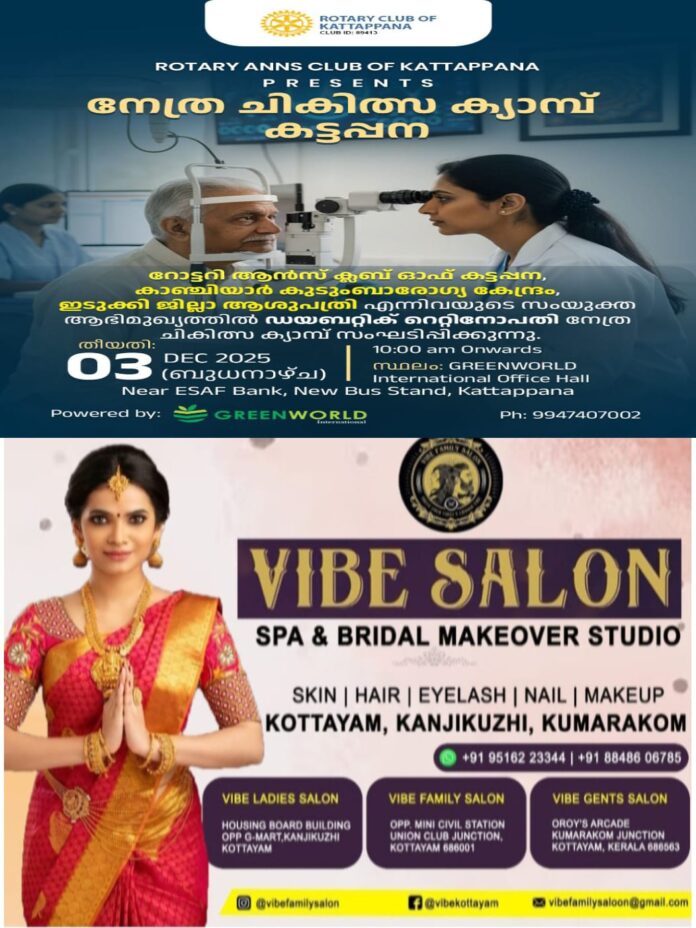 സൗജന്യ നേത്ര പരിശോധനാ ക്യാമ്പുമായി റോട്ടറി ANNS ക്ലബ് ഓഫ് കട്ടപ്പന ; ഡിസംബർ 3ന് കട്ടപ്പനയിൽ സംഘടിപ്പിക്കുന്ന ക്യാമ്പിൽ പങ്കെടുക്കാൻ താല്പര്യമുള്ളവർ 9947407002, 95391 92927 ഈ നമ്പറുകളിൽ ബന്ധപ്പെടുക