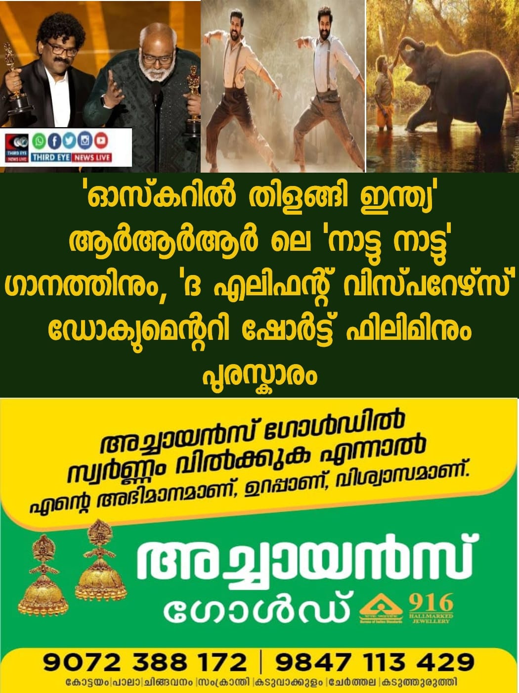 മികച്ച ഡോക്യുമെന്ററി ഹ്രസ്വചിത്രത്തിനുള്ള പുരസ്കാരം – ദ എലഫന്റ് വിസ്പറേഴ്സ് സ്വന്തമാക്കി. കാർത്തികി ഗോൾസാൽവേസ് ആണ് സംവിധായിക. ഉപേക്ഷിക്കപ്പെട്ട രണ്ട് ആനകളും അവയുടെ സംരക്ഷകരായ ആദിവാസി ദമ്പതികളും തമ്മിലുള്ള അഭേദ്യമായ ബന്ധമാണ് എലിഫന്റ് വിസ്പേഴ്സിന്റെ പ്രമേയം.