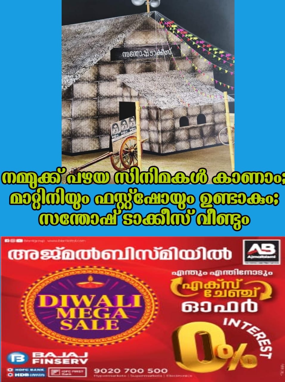 പത്തനംതിട്ട: ചെങ്ങന്നൂർ, മുണ്ടൻകാവിലെ ഓലമേഞ്ഞ പഴയ സിനിമാകൊട്ടക സന്തോഷ് ടാക്കീസ് വീണ്ടും. ഈ മാസം 25 മുതൽ 10ദിവസങ്ങൾ നമ്മുക്ക് പഴയ സിനിമകൾ കാണാം.മാറ്റിനിയും ഫസ്റ്റ്ഷോയും ഉണ്ടാകും.