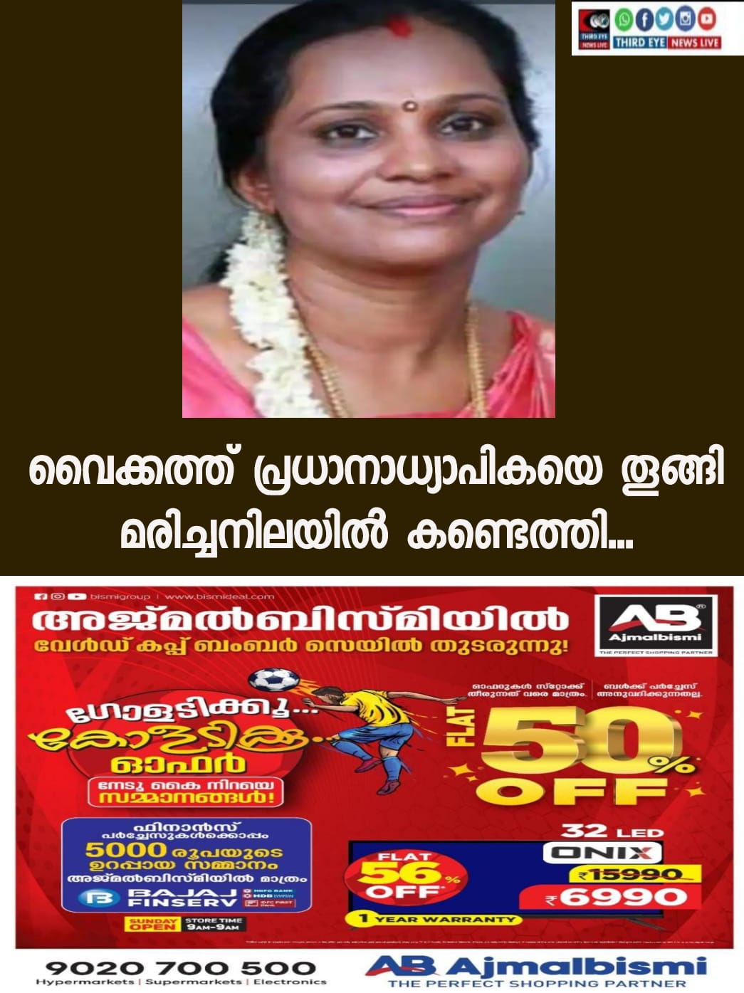 സ്കൂൾ ഹെഡ്മിസ്ട്രസ് തൂങ്ങി മരിച്ച നിലയിൽ.വൈക്കം പോളശ്ശേരി ഗവൺമെന്റ് എൽ പി എസ്സിലെ പ്രധാനാധ്യാപിക ശ്രീജയെയാണ് തൂങ്ങി മരിച്ച നിലയിൽ കണ്ടെത്തിയത്.