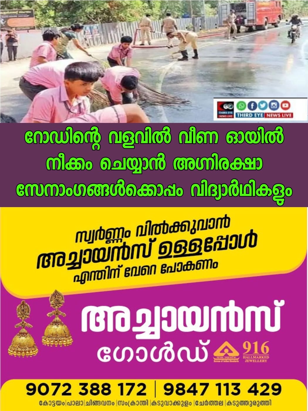 ‘അടുവയില് മഹാദേവ വിദ്യാമന്ദിര് സ്കൂളിൻ്റെ മുന്വശത്തുള്ള റോഡിൻ്റെ വളവില് ഏതോ വാഹനത്തില് നിന്നും ഓയില് ലീക്കായതിനെ തുടര്ന്ന് വാഹനങ്ങള് തെന്നി വീഴുന്നതായി നിലയത്തില് കോള് കിട്ടിയതിനെ തുടര്ന്ന് ഞങ്ങള് അവിടെ ചെന്ന് ഓയില് കഴുകി കളഞ്ഞു കൊണ്ടിരിക്കുമ്പോൾ സഹായിക്കുന്നതിനായി ഞങ്ങളോടൊപ്പം ചേര്ന്ന വിദ്യാമന്ദിറിലെ കുട്ടികള്. ഇത്രയും നല്ല കുട്ടികളേയും അതിന് ഇവരെ പ്രാപ്തരാക്കിയ അദ്ധ്യാപകര്ക്കും അഭിനന്ദനങ്ങൾ’.
