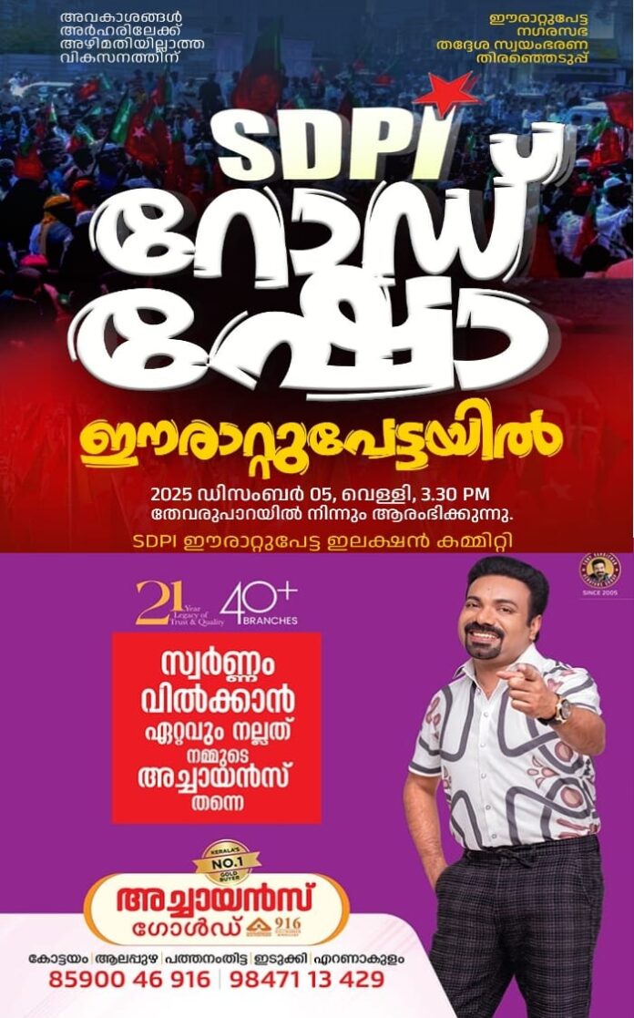 ഈരാറ്റുപേട്ട: എസ്.ഡി.പി.ഐ. റോഡ് ഷോ നടത്തുന്നു. ഈരാറ്റുപേട്ട – തദ്ദേശ സ്വയംഭരണ സ്ഥാപനങ്ങളിലേക്ക് ഈ മാസം ഒമ്പതിന് നടക്കുന്ന തിരെത്തെടുപ്പ് പ്രചരണാത്ഥം എസ്.ഡി.പി.ഐ. ഈരാറ്റുപേട്ട മുനിസിപ്പൽ കമ്മിറ്റി നേതൃതത്തിൽ സംഘടിപ്പിച്ചിട്ടുള്ള റോഡ് ഷോ ഇന്ന് വൈകിട്ട് നാല് മണിക്ക്.