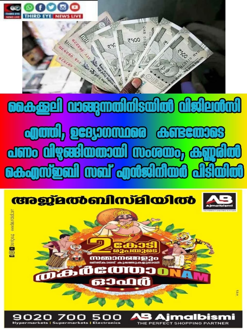 കൈക്കൂലി വാങ്ങുന്നതിനിടയിൽ വിജിലന്‍സി എത്തി; ഉദ്യോ​ഗസ്ഥരെ കണ്ടതോടെ പണം വിഴുങ്ങിയതായി സംശയം; കണ്ണൂരിൽ കെഎസ്ഇബി സബ് എന്‍ജിനീയര്‍ പിടിയിൽ