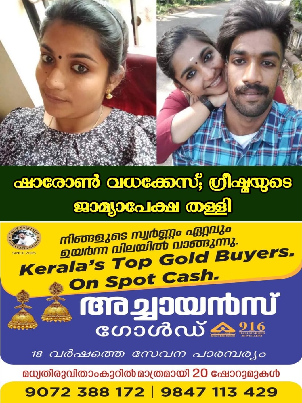 തിരുവനന്തപുരം: പാറശാല ഷാരോൺ രാജ് വധക്കേസിൽ ഒന്നാം പ്രതി ഗ്രീഷ്മയുടെ ജാമ്യാപേക്ഷ തള്ളി നെയ്യാറ്റിൻകര അഡീഷണൽ സെഷൻസ് കോടതി. പ്രതിയെ കസ്റ്റഡിയിൽ വച്ച് തന്നെ ഉടൻ വിചാരണ നടത്താൻ നേരത്തെ കോടതി അനുമതി നൽകിയിരുന്നു.