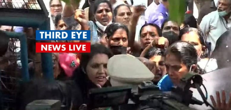 പൊലീസിനെതിരായ മുദ്രാവാക്യം വിളികളുമായി വനിതാ പ്രവർത്തകർ ഓഫീസിന് മന്നിൽ തടിച്ചുകൂടിയിരിക്കുകയാണ്. പൊലീസും മഹിളാ കോൺ​ഗ്രസ് പ്രവർത്തകരും തമ്മിൽ ഉന്തും തള്ളുമുണ്ടായി. വനിതാ പൊലീസുകാർ ഉൾപ്പടെ പ്രവർത്തകരുമായി ആശയവിനിമയം നടത്തുന്നുണ്ട്.