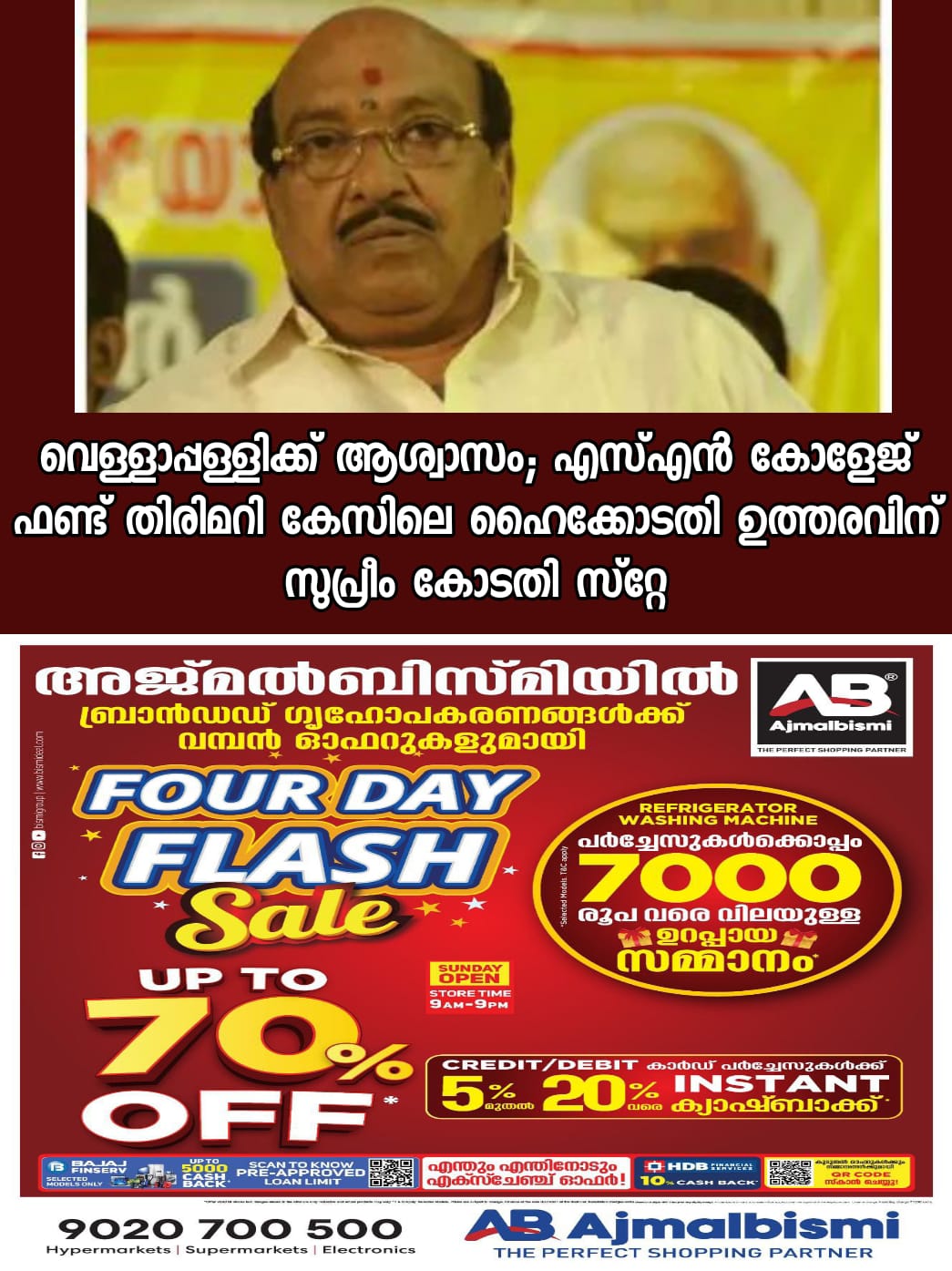 തുടരന്വേഷണം റദ്ദാക്കിയതിനെതിരെയാണ് വെള്ളാപ്പള്ളി അപ്പീല് നല്കിയത് .എതിര്കക്ഷികള്ക്ക് നോട്ടീസക്കാനും സുപ്രീംകോടതി നിര്ദേശം നല്കി.എസ് എന് കോളേജ് സുവര്ണ്ണ ജൂബിലി ഫണ്ട് തട്ടിപ്പ് കേസില് വെള്ളാപ്പള്ളി നടേശന് വിചാരണ നേരിടണമെന്നായിരുന്നു ഹൈക്കോടതി വിധി. വെള്ളാപ്പള്ളി പ്രതിയായ ആദ്യ കുറ്റപത്രം നിലനില്ക്കുന്നതിനിടെ തുടരന്വേഷണത്തിന് ഉത്തരവിട്ട കൊല്ലം സിജെഎം കോടതി ഉത്തരവ് നിയമപരമല്ലെന്നും ഹൈക്കോടതി വ്യക്തമാക്കിയിരുന്നു.ഇതിനെതിരെയാണ് വെള്ളാപ്പള്ളി സുപ്രീംകോടതിയെ സമീപിച്ചത്.