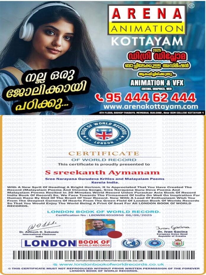 കോട്ടയം: എഴുത്തുകാരനും അദ്ധ്യാപകനുമായ എസ് ശ്രീകാന്ത് അയ്മനം മൂന്നാം തവണയും ലണ്ടൻ ബുക്ക് ഓഫ് റെക്കോർഡ്സിൽ ഇടം നേടി.