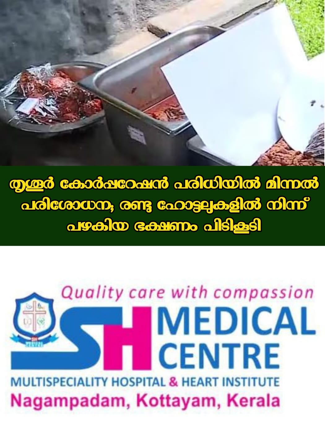 തൃശൂര്: കോര്പ്പറേഷനിലെ ആരോഗ്യവിഭാഗത്തിന്റെ മിന്നൽ പരിശോധന. രണ്ടു ഹോട്ടലുകളില് നിന്ന് പഴകിയ ഭക്ഷണം പിടികൂടി. ഒളരി നിയ റീജന്സി, അയ്യന്തോള് റാന്തല് റെസ്റ്റോറന്റ് എന്നിവിടങ്ങളില് നിന്നാണ് ഭക്ഷ്യയോഗ്യമല്ലാത്ത ഭക്ഷണ പദാര്ത്ഥങ്ങള് പിടികൂടിയത്.