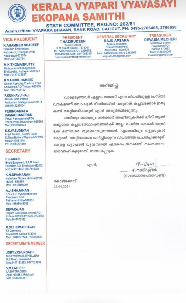 ശനിയും ഞായറും വ്യാപാരസ്ഥാപനങ്ങൾ തുറന്ന് പ്രവർത്തിക്കുമെന്ന് വ്യാപാരി വ്യവസായി ഏകോപന സമിതി സംസ്ഥാന പ്രസിഡന്റ്