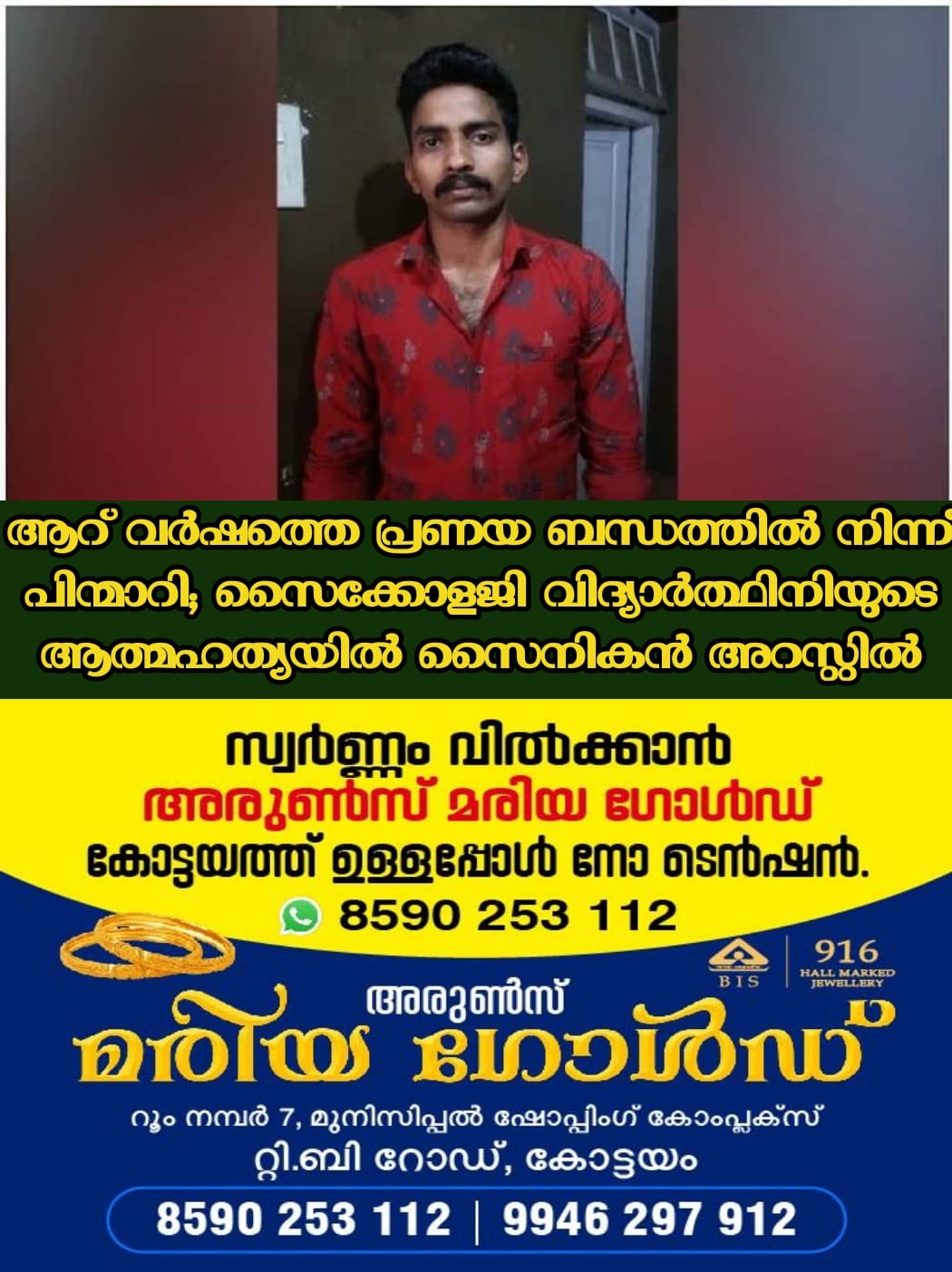 കൊല്ലം: ആറ് വർഷത്തെ പ്രണയ ബന്ധത്തിൽ നിന്ന് പിന്മാറിയതിന്റെ മനോവിഷമത്തിൽ കോട്ടത്തല സ്വദേശിയും എംഎ സൈക്കോളജി വിദ്യാർത്ഥിനിയുമായ വൃന്ദ രാജിന്റെ ആത്മഹത്യയിൽ കാമുകനും സൈനികനുമായ പ്രതി പിടിയിൽ.