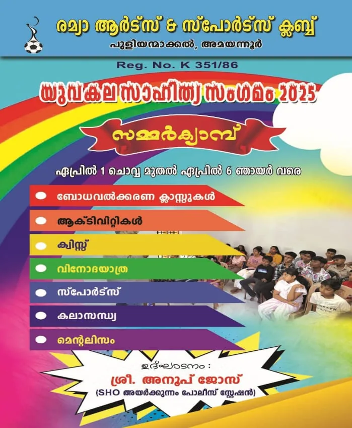 കോട്ടയം: രമ്യാ ആർട്സ് ആൻഡ് സ്പോർട്സ് ക്ലബ്ബിന്റെ നേതൃത്വത്തിൽ ഏപ്രിൽ ഒന്നു മുതൽ ആറുവരെ അമയന്നൂർ പുളിയന്മാക്കലിൽ കുട്ടികൾക്കായി സമ്മർ ക്യാമ്പ് നടത്തുന്നു.