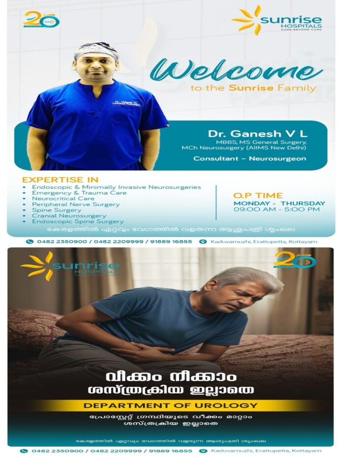 ഈരാറ്റുപേട്ട സൺറൈസ് ആശുപത്രിയിൽ പുതിയ ന്യൂറോസർജറി വിദഗ്ധൻ സേവനമാരംഭിച്ചു. മിനിമലി ഇൻവേസീവ് ബ്രെയിൻ ശസ്ത്രക്രിയയിലും എൻഡോസ്കോപിക് സ്പൈൻ ശസ്ത്രക്രിയയിലും മികച്ച പരിചയസമ്പത്തും അത്യാധുനിക സാങ്കേതിക വൈദഗ്ധ്യവും നേടിയ ഡോ. ഗണേഷ് വി. എൽ ആണ് സേവനം ആരംഭിച്ചത്. ന്യൂറോസർജറി വിഭാഗത്തിലെ കൺസൾട്ടന്റ് ന്യൂറോസർജൻ ആയി ചുമതലയേറ്റിരിക്കുന്ന ഡോ. ഗണേഷ്, രാജ്യത്തെ മുൻനിര മെഡിക്കൽ സ്ഥാപനങ്ങളിൽ നിന്ന് സമഗ്രവും ഉയർന്ന നിലവാരമുള്ള പരിശീലനം നേടിയ വിദഗ്ധനാണ്.