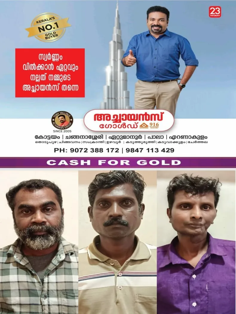 പാലാ സ്റ്റേഷൻ എസ്.ഐ ബിജു ചെറിയാൻ, സി.പി.ഓ മാരായ അഖിലേഷ്, ദീപ്ത്, സിനോജ് എന്നിവർ ചേർന്നാണ് ഇവരെ അറസ്റ്റ് ചെയ്തത്. കോടതിയിൽ ഹാജരാക്കിയ മൂവരെയും റിമാൻഡ് ചെയ്തു.