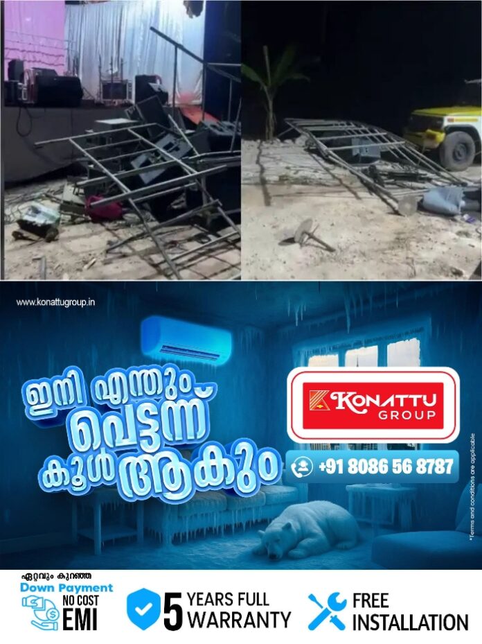 സ്റ്റേജിലെ സാധനങ്ങളും വിലകൂടിയ സ്പീക്കറുകളടക്കം അടിച്ചുതകര്ത്തു. സംഘാടകരുടെ വാഹനങ്ങളുടെ ഗ്ലാസും തകര്ത്തു. സംഭവത്തില് സ്ഥലത്തുണ്ടായിരുന്ന പൊലീസുകാര് ഇടപെട്ടില്ലെന്നാണ് പരാതി. സംഭവത്തില് പൊലീസ് കേസെടുത്തെങ്കിലും ആരെയും കസ്റ്റഡിയിലെടുത്തിട്ടില്ല.