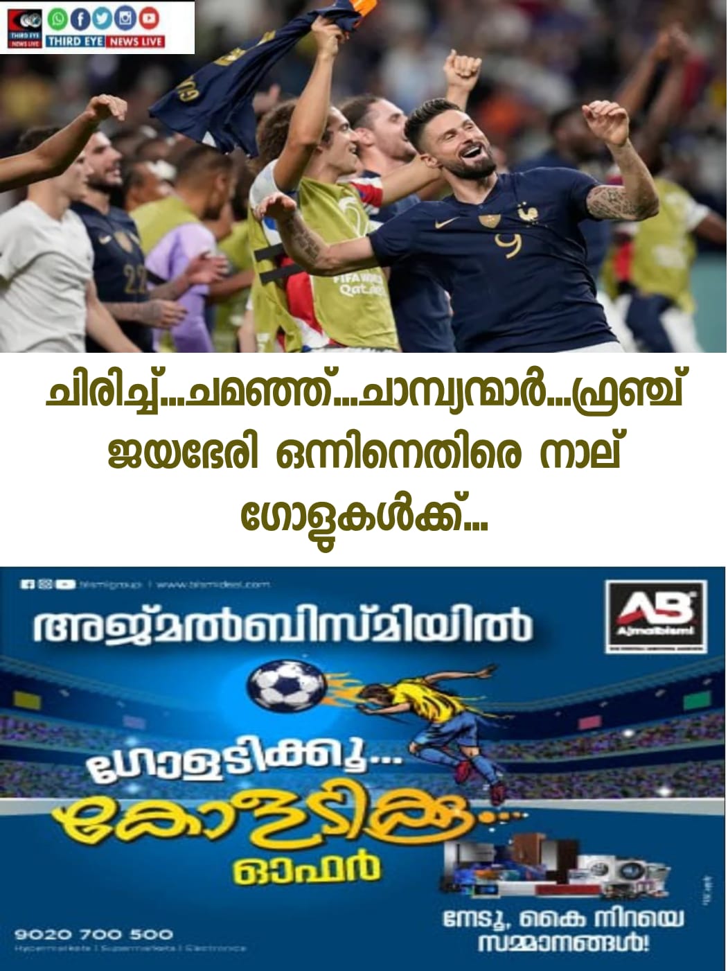 പരിക്കിലും ഫ്രാൻസിന് ഒട്ടും ക്ഷീണമില്ല. ആദ്യ മത്സരത്തിനിറങ്ങിയ ചാമ്പ്യൻമാർ ഓസ്ട്രേലിയയെ 4–-1ന് തുരത്തി. ഒളിവർ ജിറൂ ഇരട്ടഗോൾ നേടി. ഫ്രാൻസിന്റെ എക്കാലത്തെയും മികച്ച ഗോളടിക്കാരിൽ തിയറി ഒൻറിക്ക് ഒപ്പമെത്തി. ഇരുവർക്കും 51 ഗോളാണ്. ആഡ്രിയൻ റാബിയറ്റും കിലിയൻ എംബാപ്പെയും ലക്ഷ്യം കണ്ടു. രണ്ട് ഗോളിന് വഴിയുമൊരുക്കി എംബാപ്പെ. രണ്ടാം ലോകകപ്പിനിറങ്ങിയ ഇരുപത്തിമൂന്നുകാരന് ആകെ അഞ്ച് ഗോളായി. ക്രെയ്ഗ് ഗുഡ്വിന്നിലൂടെ ഒമ്പതാം മിനിറ്റിൽ ഓസ്ട്രേലിയയായിരുന്നു മുന്നിലെത്തിയത്. എന്നാൽ ചാമ്പ്യൻമാരുടെ കളി പുറത്തെടുത്ത ഫ്രഞ്ചുകാർ എതിരാളിയെ പിന്നെ നിലംതൊടീച്ചില്ല.