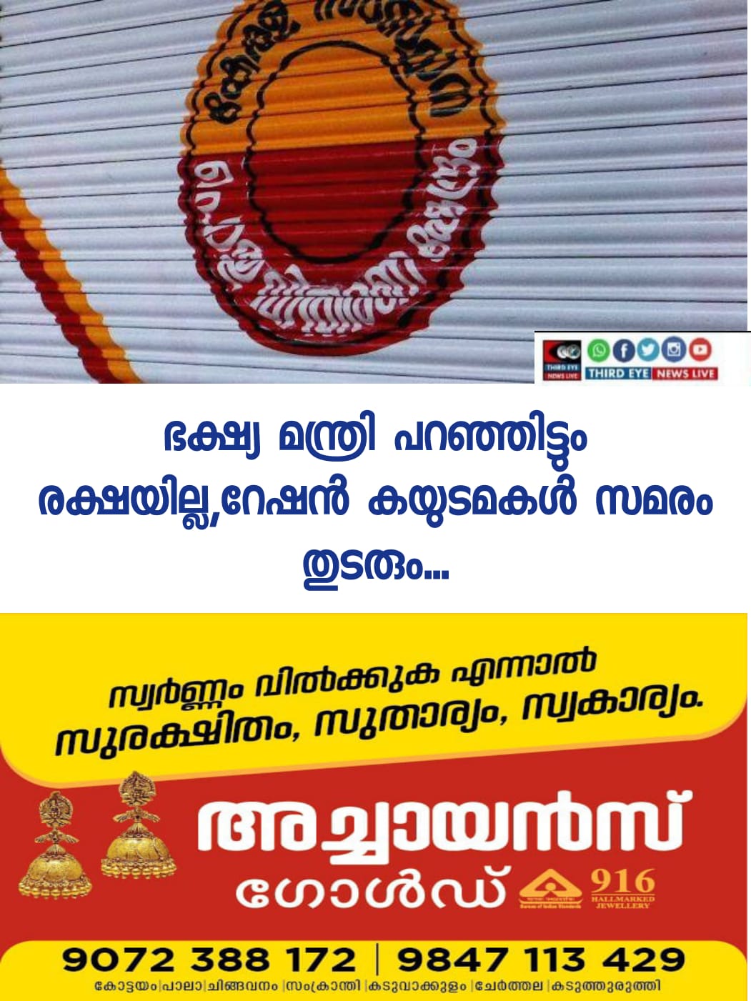 കമ്മീഷന് തുക നല്കുമെന്നും ആവശ്യമായ തുകക്കായി ധനകാര്യ വകുപ്പിനെ സമീപിച്ചിട്ടുണ്ടെന്നും അറിയിച്ച ഭക്ഷ്യമന്ത്രി ജി.ആര് അനില് സമരത്തില് നിന്ന് പിന്മാറാന് ആവശ്യപ്പെട്ടു. എന്നാല് ബാക്കിയുള്ള കുടിശ്ശിക തുക അനുവദിക്കാതെ വെറും ഉറപ്പുകൊണ്ടുമാത്രം സമരത്തില് നിന്ന് പിന്മാറില്ലെന്ന നിലപാടിലാണ് സംയുക്ത സമരസമിതി. റേഷന് കേന്ദ്ര വിഹിതത്തിന്റെ കമ്മീഷനടക്കം നല്കേണ്ട ബാധ്യത സംസ്ഥാനത്തിനായതാണ് പ്രതിസന്ധിയുണ്ടാക്കിയതെന്നാണ് ഭക്ഷ്യവകുപ്പ് പറയുന്നത്.