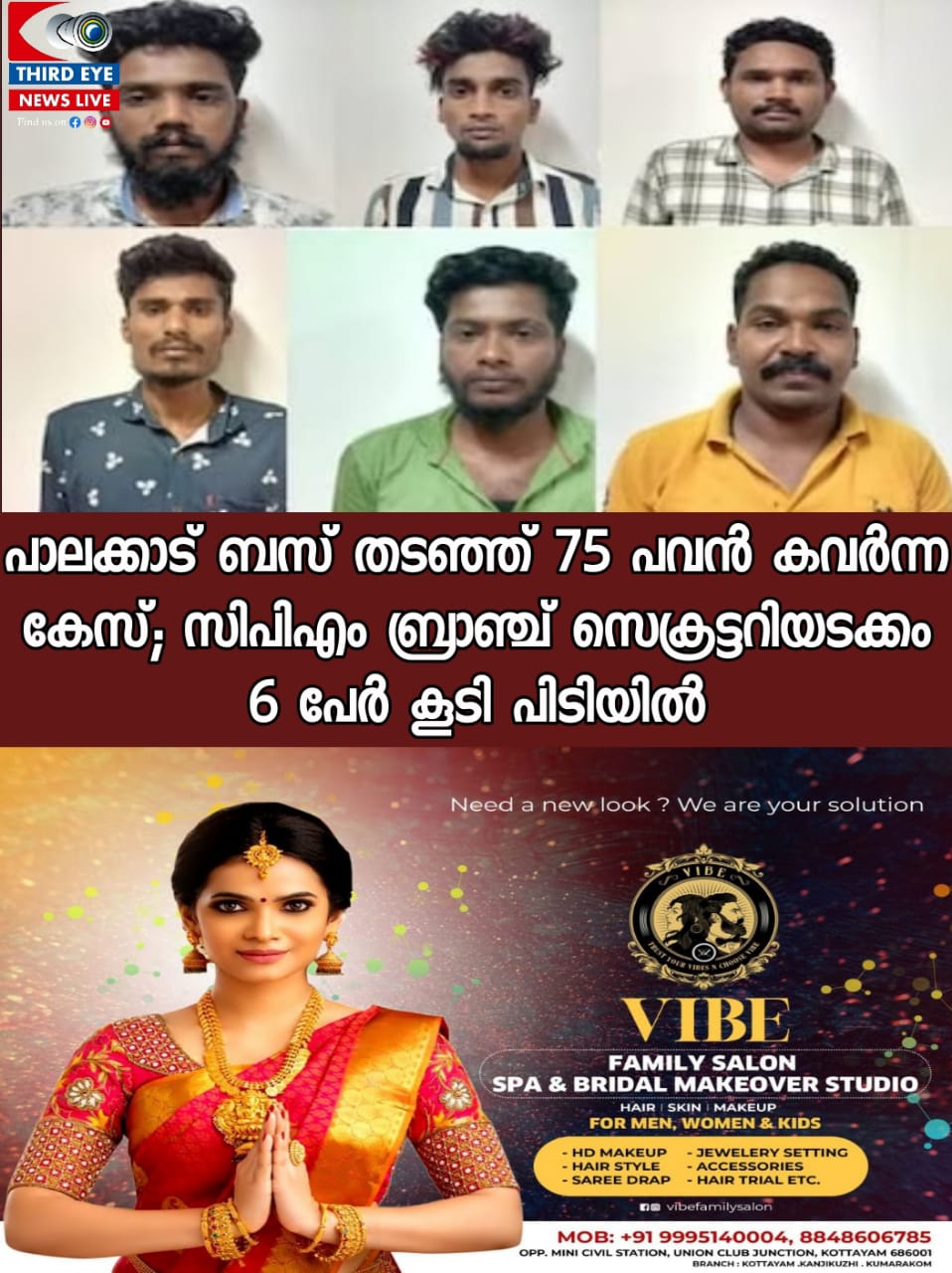 പാലക്കാട്: പാലക്കാട്: മീനാക്ഷിപുരത്ത് ബസ് തടഞ്ഞ് സ്വർണം തട്ടിയെടുത്ത കേസില് സിപിഎം ബ്രാഞ്ച് സെക്രട്ടറിയടക്കം ആറു പേർ കൂടി പിടിയിൽ. പാലക്കാട് സ്വദേശികളായ അജിത്, രാഹുൽ, ഡിക്സൺ, രഞ്ജിത്, വിശാഖ്, മുരളിദാസ് എന്നിവരാണ് അറസ്റ്റിലായത്.