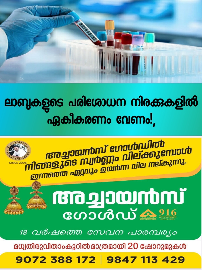 കുറവിലങ്ങാട്: കേരളത്തിലെ സർക്കാർ നിയന്ത്രിണത്തീൽ മെഡിക്കൽ ലാബുകളിലെ പരിശോധന നിരക്കുകളിൽ ഏകീകൃത തുക ഏർപ്പെടുത്തണമെന്നുള്ള ആവശ്യം ശക്തമായി.