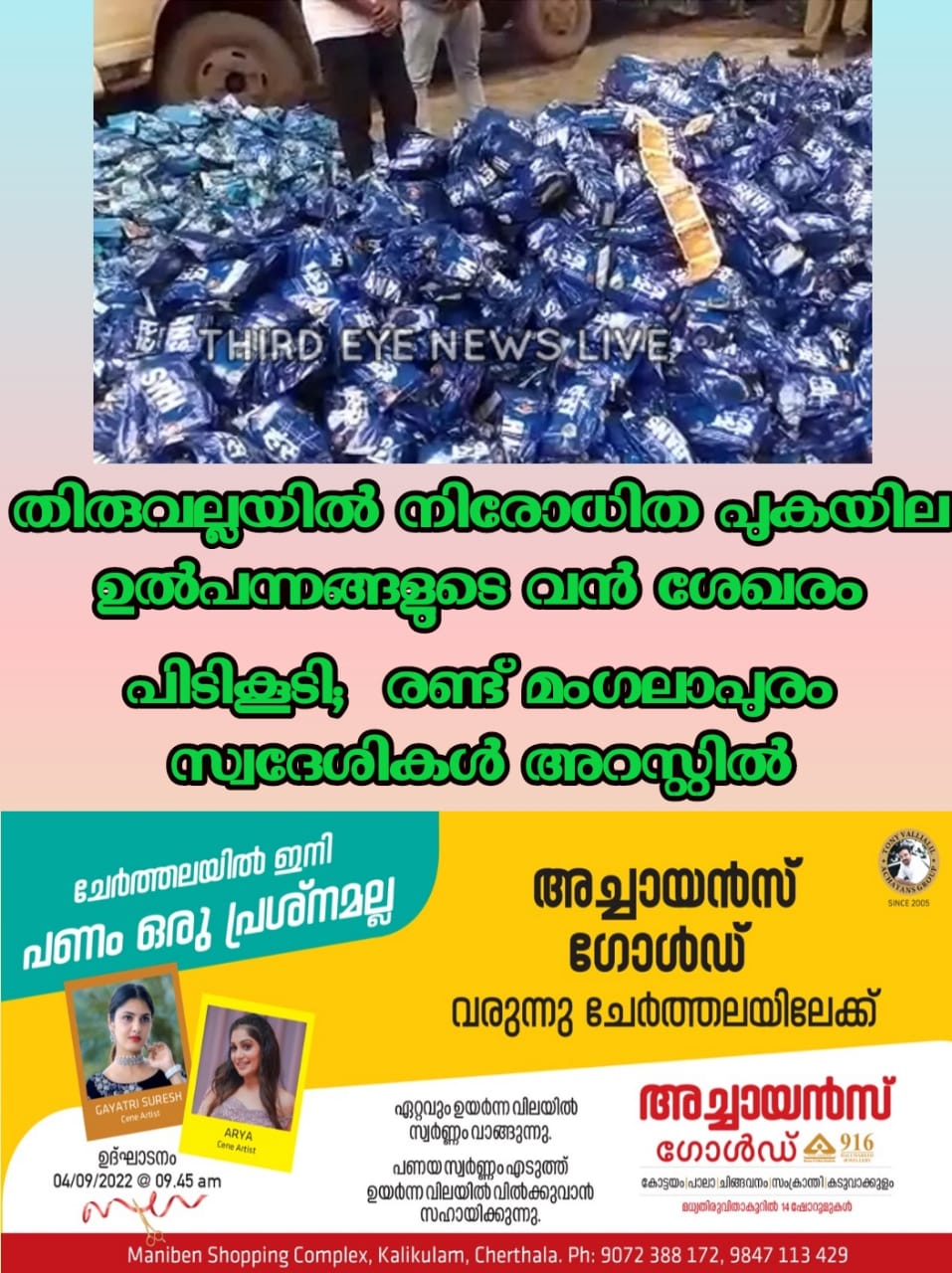 തിരുവല്ല: പൊടിയാടിയിൽ നിന്നും മിനി ലോറിയിൽ കടത്തുകയായിരുന്ന 30 ലക്ഷത്തോളം രൂപ വില വരുന്ന നിരോധിത പുകയില ഉൽപന്നങ്ങളുമായി മംഗലാപുരം സ്വദേശികളായ രണ്ട് പേർ പിടിയിൽ. ലോറി ഓടിച്ചിരുന്ന മംഗലാപുരം ബെഗ്രേ കസബയിൽ എം.ജെ.എം സ്ട്രീറ്റിൽ റഫീഖ് മുഹമ്മദ് ത്വാഹ, സഹായി സംഗബേട്ട് കൽക്കുരി വീട്ടിൽ സിറാജുദീൻ എന്നിവരാണ് പിടിയിലായത്.