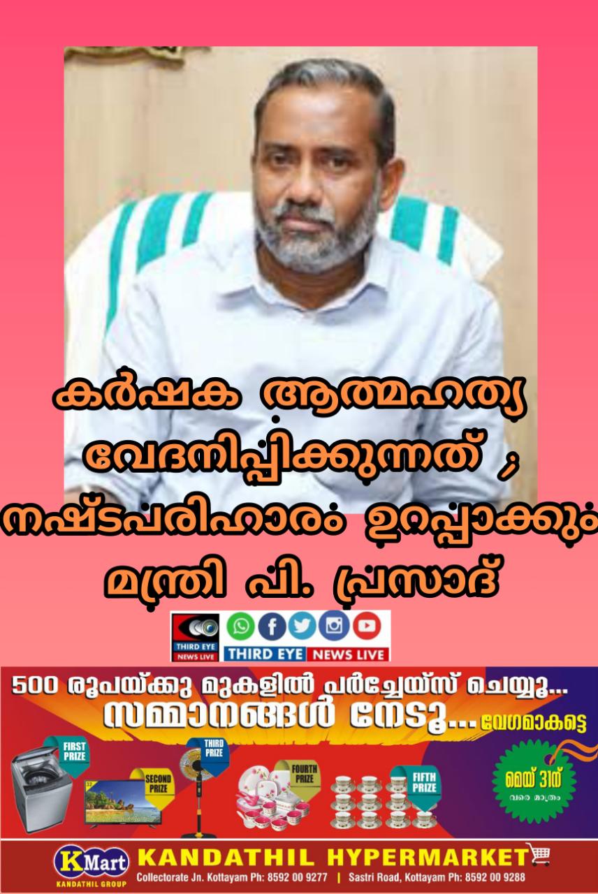 തിരുവനന്തപുരം : തിരുവല്ല നിരണത്ത് കർഷകൻ ജീവനൊടുക്കിയ സംഭവം വേദനിപ്പിക്കുന്നതാണെന്നു കൃഷി മന്ത്രി പി.പ്രസാദ് പ്രതികരിച്ചു. കൃഷിനാശം ഉണ്ടായാൽ ഉടൻ നഷ്ടപരിഹാരം നൽകുന്നതിന് ഇൻഷുറൻസ് വ്യവസ്ഥ പുതുക്കും. അർഹമായ നഷ്ടപരിഹാരം കർഷകർക്ക് ഉറപ്പാക്കുമെന്നും മന്ത്രി പറഞ്ഞു.