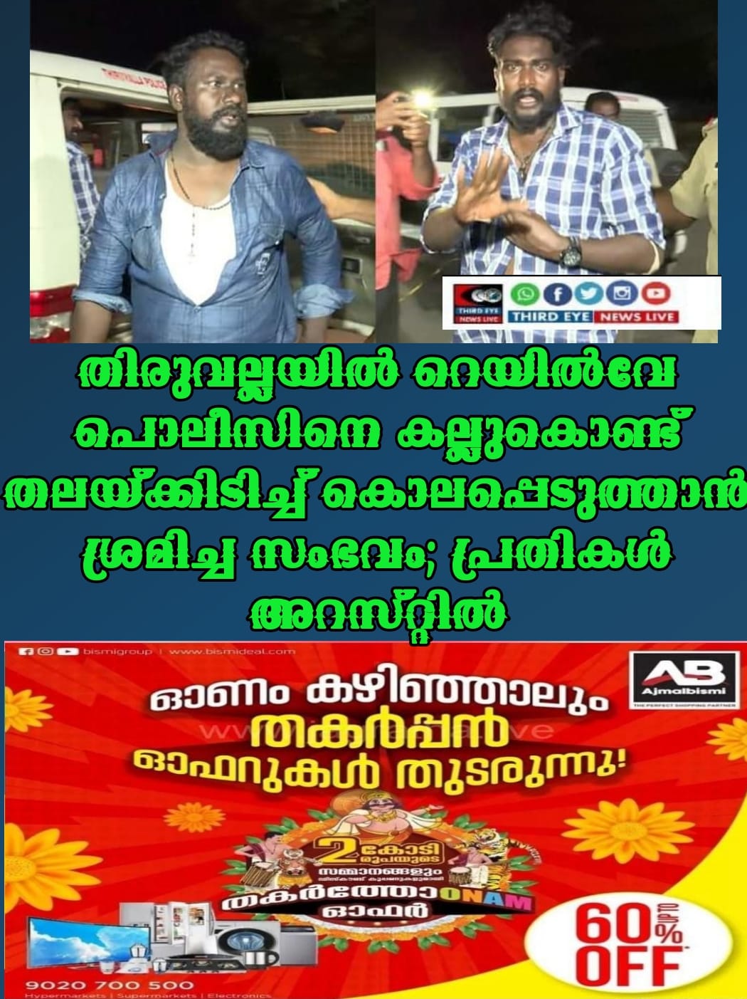 തിരുവല്ല :റെയില്വേ പൊലീസിനെ കല്ലുകൊണ്ട് തലയ്ക്കിടിച്ച് കൊലപ്പെടുത്താന് ശ്രമിച്ച പ്രതികള് കസ്റ്റഡിയില്. ആലപ്പുഴ ചമ്പക്കുളം മയ്യന്കുഴി അജി (32), തിരുവല്ല മഞ്ഞാടി ഉതിമൂട്ടില് ജിബിന് (27), കവിയൂര് കുന്നില് താഴെ ശ്രീജിത്ത് ( ലിജിന്-32) എന്നിവരാണ് തിരുവല്ല പൊലീസിന്റെ പിടയിലായത്.