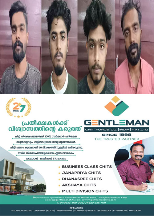 തിരുവല്ല കുരിശുകവല ശങ്കരമംഗലത്ത് താഴത്തേതില് വീട്ടില് കൊയിലാണ്ടി രാഹുല് എന്ന് വിളിക്കുന്ന രാഹുല് മനോജ്(26), കുറ്റപ്പുഴ മഞ്ഞാടി മംഗലശ്ശേരി വീട്ടില് ജിജോ ജോയ് (23), തുകലശ്ശേരി കൂട്ടത്തില് വീട്ടില് ആദിത്യരാജ് (23), കുറ്റപ്പുഴ സഊരിയത്ത് വീട്ടില് കിരണ് വില്യംസ് തോമസ് (22) എന്നിവരാണ് പിടിയിലായത്.