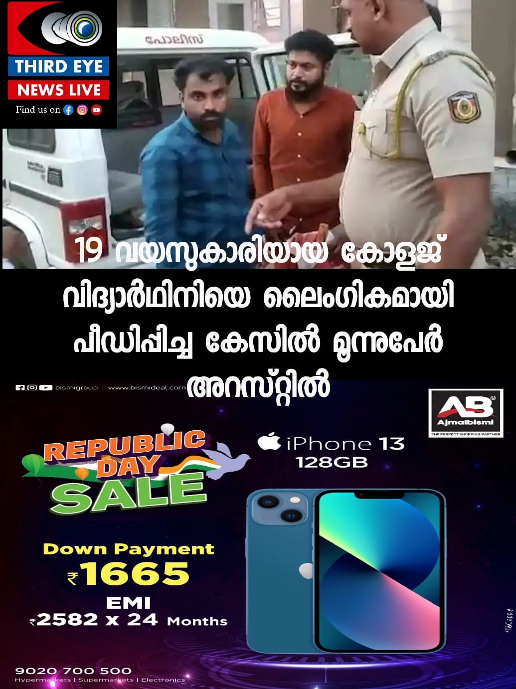 പത്തൊന്‍പതു വയസുകാരിയായ കോളജ് വിദ്യാര്‍ഥിനിയെ ലൈംഗികമായി പീഡിപ്പിച്ച കേസിൽ മൂന്നുപേര്‍ അറസ്റ്റില്‍