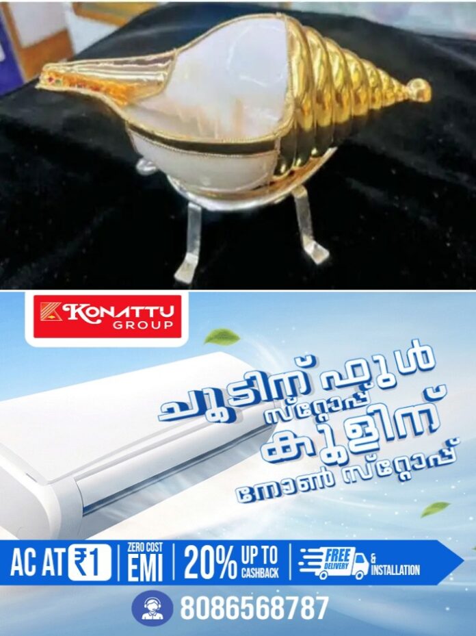 കൊച്ചി: തൃപ്പൂണിത്തുറ ശ്രീ പൂർണത്രയീശ ക്ഷേത്രത്തില് വഴിപാടായി അജ്ഞാതൻ സ്വർണം കെട്ടിയ ശംഖ് സമർപ്പിച്ചു.
