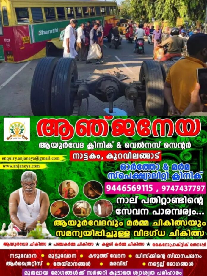 ദേശീയ പാതയില് നിന്ന് തൃശൂര് റൂട്ടിലേക്ക് കടക്കുന്നതിനിടെ പെട്ടി ഓട്ടോ റിക്ഷയില് ഇടിക്കുകയും ഓട്ടോറിക്ഷ മറിയുകയും ചെയ്തിരുന്നു. മുന്നോട്ട് പോയ ബസ്സില് തൃശൂര് ഭാഗത്തുനിന്നും വരികയായിരുന്ന കാര് ഇടിച്ചു. മുന്നില് നിന്നും തട്ടിയ കാര് പിന് ഭാഗത്തെ ചക്രത്തിലേക്ക് ഇടിച്ചു കയറി. ഇതേത്തുടര്ന്നാണ് ചക്രം ഊരിത്തെറിച്ചത്.