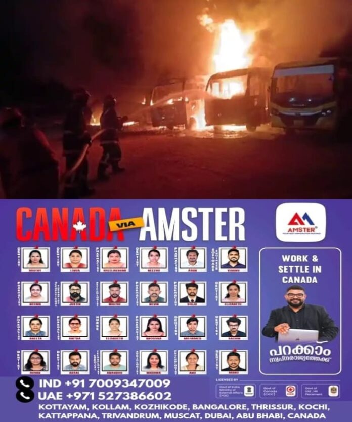 സ്കൂള് ഗ്രൗണ്ടില് പാർക്ക് ചെയ്ത . മൂന്നു ബസുകള് പൂർണമായും ഒരു ബസ് ഭാഗികമായും കത്തിനശിച്ചു. പുലർച്ചെ മൂന്ന് മണിയോടെയാണ് സംഭവം. തീ ആളിക്കത്തുന്നത് കണ്ട നാട്ടുകാരാണ് ഫയർഫോഴ്സില് വിവരമറിയിച്ചത്.