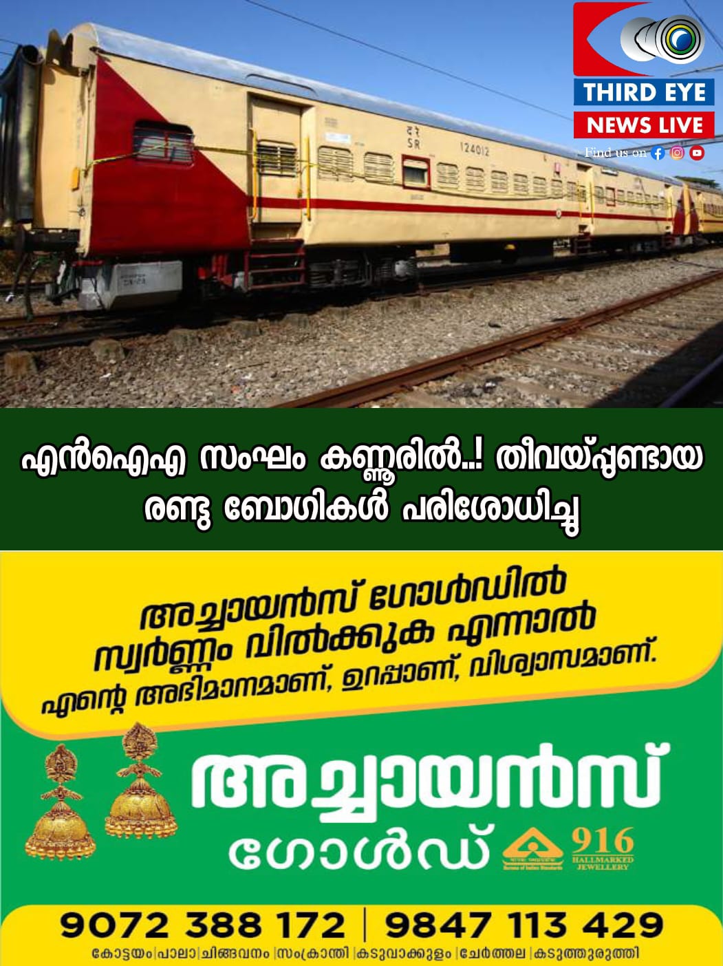 കണ്ണൂർ : കോഴിക്കോട് എലത്തൂരിൽ ഓടുന്ന ട്രെയിനിൽ യാത്രക്കാരുടെ ദേഹത്തു പെട്രോൾ ഒഴിച്ചു തീകൊളുത്തിയ കേസിൽ എൻഐഎ സംഘം കണ്ണൂരിലെത്തി. കൊച്ചി, ബെംഗളൂരു ഓഫിസിലെ ഉദ്യോഗസ്ഥരാണ് എത്തിയത്. തീവയ്പ്പുണ്ടായ ബോഗി ഇവർ പരിശോധിച്ചു. ആർപിഎഫ് സതേൺ റെയിൽവേ സോണൽ ഐജി ജി.എം. ഈശ്വര റാവുവും ബോഗി പരിശോധിച്ചിരുന്നു.