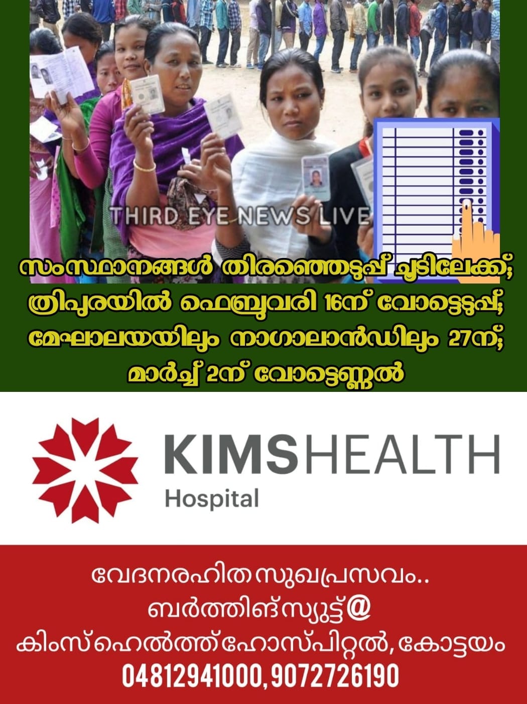 നാഗാലാന്ഡ് നിയമസഭയുടെ കാലാവധി മാര്ച്ച് 12നും, മേഘാലയില് മാര്ച്ച് പതിനഞ്ചിനുംസ ത്രിപുരയില് മാര്ച്ച് 22നും അവസാനിക്കും. മൂന്ന് നിയമസഭയുടെയും കാലവധി അവസാനിക്കും. അറുപതംഗ നിയമസഭയാണ് മൂന്ന് സംസ്ഥാനങ്ങളിലും ഉള്ളത്. നിലവില് മൂന്ന് ഇടങ്ങളിലും ബിജെപി നേതൃത്വത്തിലുള്ള മുന്നണിയാണ് ഭരണം നടത്തുന്നത്. ത്രിപുരയില് ബിജെപിയെ അധികാരത്തില് നിന്ന് മാറ്റുക ലക്ഷ്യമിട്ട് സിപിഎം കോണ്ഗ്രസ് പാര്ട്ടികള് സംയുക്തമായാകും തെരഞ്ഞെടുപ്പിനെ നേരിടുക. ഭരണവിരുദ്ധ വികാരമുണ്ടായ സാഹചര്യത്തില് ബിപ്ലബ് ദേബിനെ മാറ്റി മണിക് സാഹയെ മുഖ്യമന്ത്രിയാക്കിയത് ഭരണത്തുടര്ച്ച ലക്ഷ്യമിട്ടാണ്.