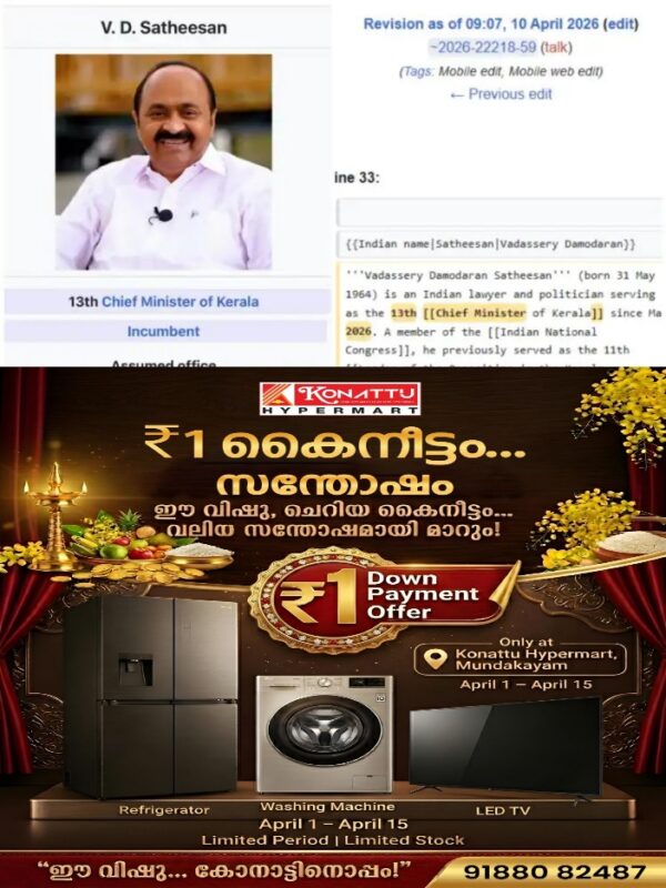വി ഡി സതീശനെ കേരളത്തിന്റെ 13-ാം മുഖ്യമന്ത്രിയാക്കി കൊണ്ടായിരിരുന്നു ആദ്യ എഡിറ്റിംഗ്. 2026 മേയ് നാലിന് ചുമതലയേറ്റതെന്നും എഡിറ്റ് ഹിസ്റ്ററിയില് നിന്നുള്ള വിവരങ്ങള് വ്യക്തമാക്കുന്നു. പിന്നാലെ അദ്ദേഹത്തിന്റെ പേജില് വീണ്ടും എഡിറ്റിംഗ് ചെയ്തിട്ടുണ്ട്.