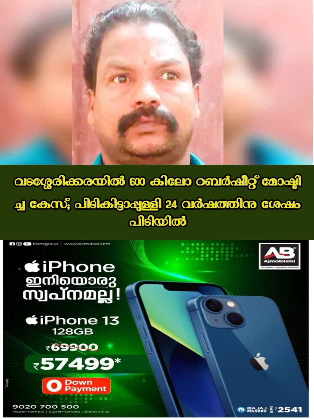 വടശ്ശേരിക്കര: 600 കിലോ റബർഷീറ്റ് മോഷ്ടിച്ച കേസിൽ പിടികിട്ടാപ്പുള്ളിയായ മോഷ്ടാവിനെ 24 വർഷത്തിനു ശേഷം പെരുന്നാട് പൊലീസ് അറസ്റ്റ് ചെയ്തു. നാരങ്ങാനം ആലുങ്കൽ പള്ളിമുരുപ്പേൽ വീട്ടിൽ തങ്കച്ചനെയാണ് തിങ്കളാഴ്ച പിടികൂടിയത്.