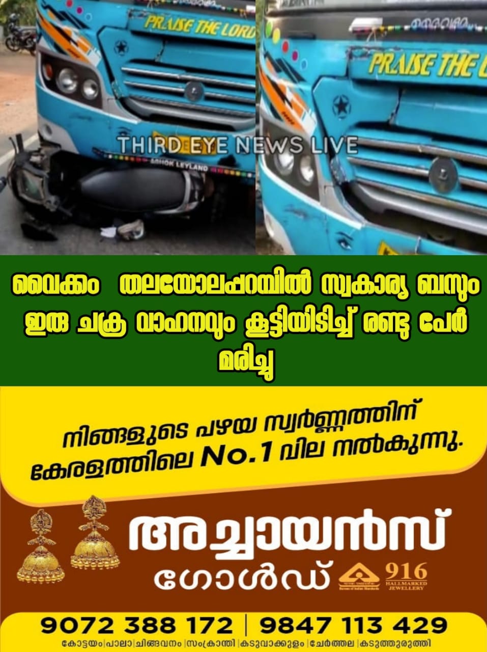 കോട്ടയം: വൈക്കം തലയോലപ്പറമ്പിൽ സ്വകാര്യബസും സ്കൂട്ടറും കൂട്ടിയിടിച്ചുമ്ടായ അപകടത്തിൽ രണ്ടു പേർ മരിച്ചു.