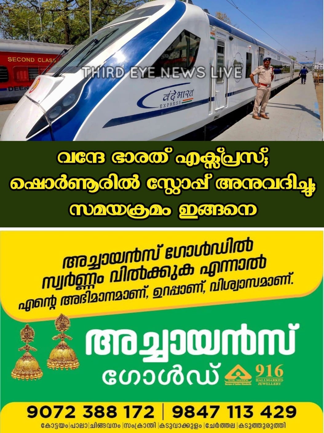 വ്യാഴാഴ്ചകളിൽ സർവീസ് ഉണ്ടാകില്ല. വിവിധ കോണുകളിൽ നിന്ന് ഉയർന്ന ആവശ്യത്തെ തുടർന്ന് ഷൊർണൂരിൽ വന്ദേഭാരതിന് സ്റ്റോപ്പ് അനുവദിച്ചു. അതേസമയം ചെങ്ങന്നൂർ, തിരൂർ സ്റ്റേഷനുകളിൽ സ്റ്റോപ്പ് ഉണ്ടാകില്ല.