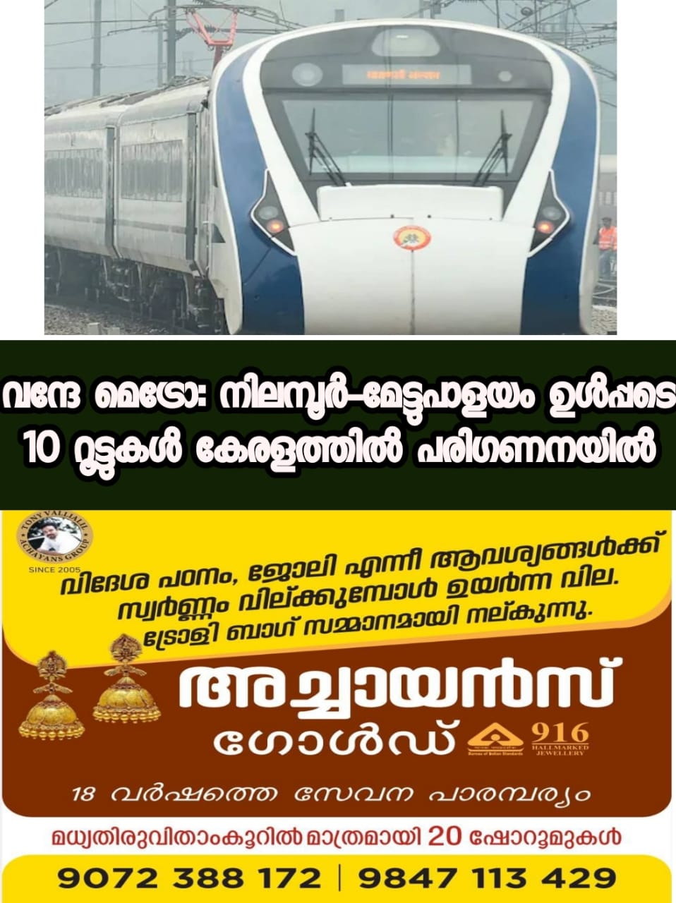 സഞ്ചാരികൾക്ക് മികച്ച യാത്രാനുഭവവുമായി വന്ദേ മെട്രോ: പാലക്കാട്-കോട്ടയം, നിലമ്പൂർ-മേട്ടുപാളയം, ഉൾപ്പടെ 10 റൂട്ടുകൾ കേരളത്തിൽ പരിഗണനയിൽ; ദൂരപരിധി 200 കിലോമീറ്റർ; ശീതികരിച്ച 12 കോച്ചുകൾ